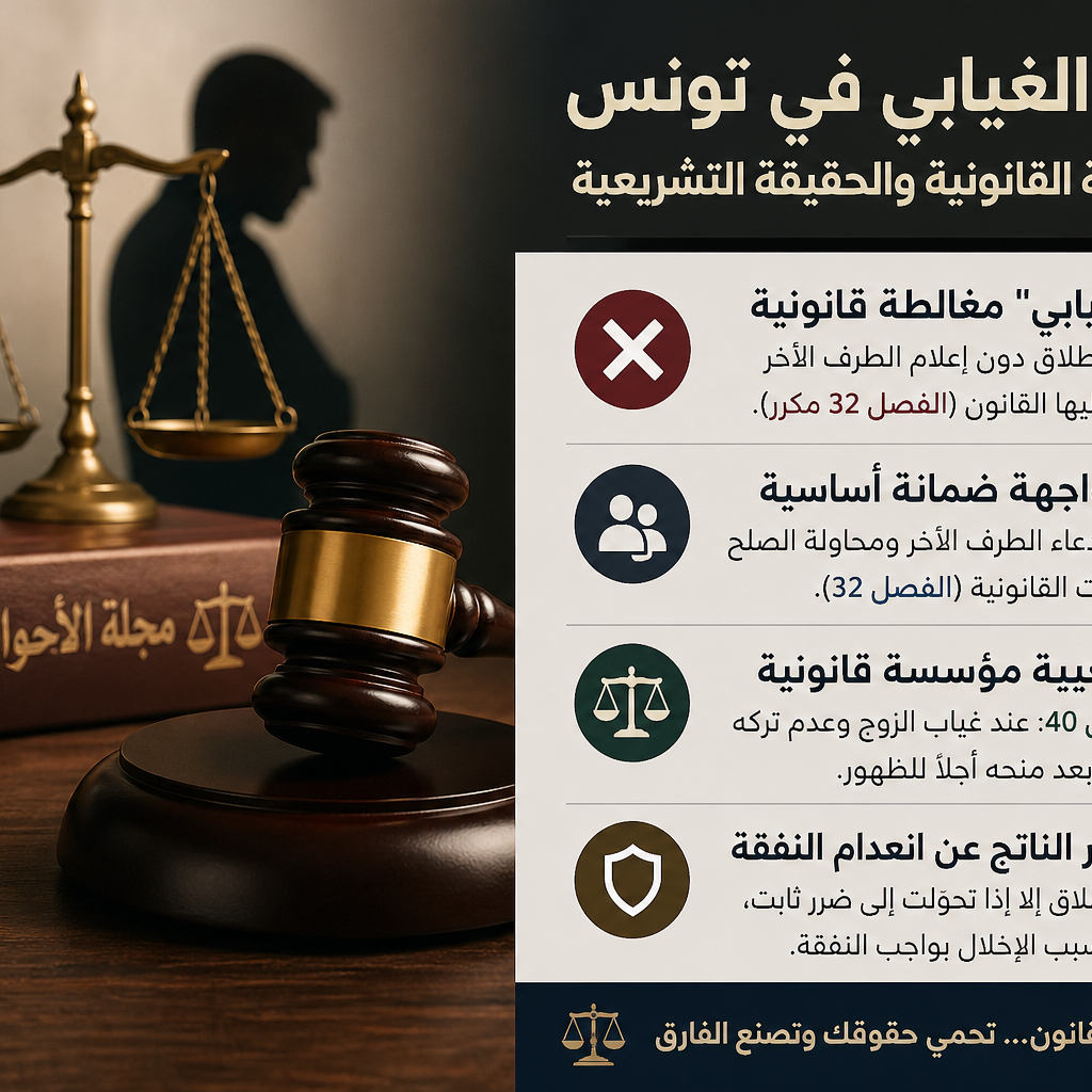 لا يوجد في القانون التونسي ما يعرف لدى الكافة “بالطلاق الغيابي” باعتبار أنّ استصدار حكم طلاق مهما كانت طبيعته ودون احترام مبدأ المواجهة من خلال عدم استدعاء الضدّ أو السعي إلى تبليغه عريضة الدعوى إلى عنوان لا يخصّه ولا يقطن به، يشكّل جريمة وردت بالفصل 32 مكرّر من مجلة الأحوال الشخصية الذي ينصّ على أنّ: “إذا تحيّل أحد الزوجين لغاية عدم بلوغ الاستدعاء إلى الطرف الآخر، يعاقب بالسجن مدّة عام”…